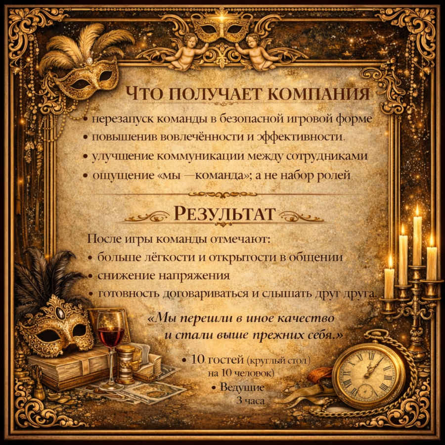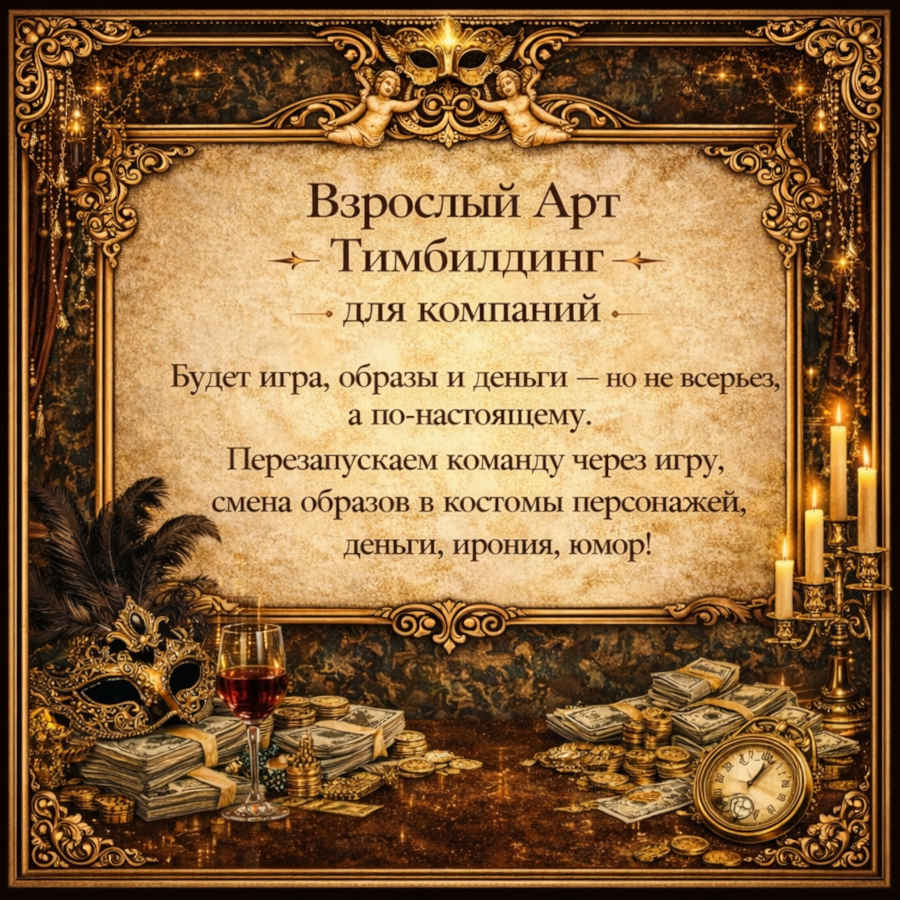 Мы перезапускаем команду через игру, смену образов, костюмы персонажей, иронию, юмор и лёгкий театральный маскарад. Участники выходят из привычной рабочей среды и оказываются в арт-пространстве, где маски должностей снимаются сами.