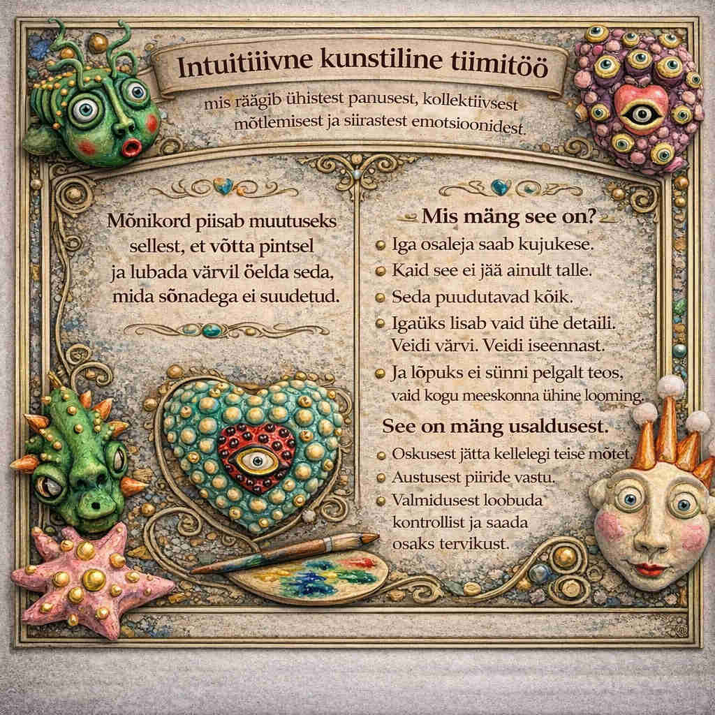 Iga osaleja saab kujukese. Kuid see ei jää ainult talle. Seda puudutavad kõik. Igaüks lisab vaid ühe detaili. Veidi värvi. Veidi iseennast. Ja lõpuks ei sünni pelgalt teos — vaid kogu meeskonna ühine looming. See on mäng usaldusest. Oskusest jätkata kellegi teise mõtet. Austusest piiride vastu. Valmidusest loobuda kontrollist ja saada osaks tervikust.